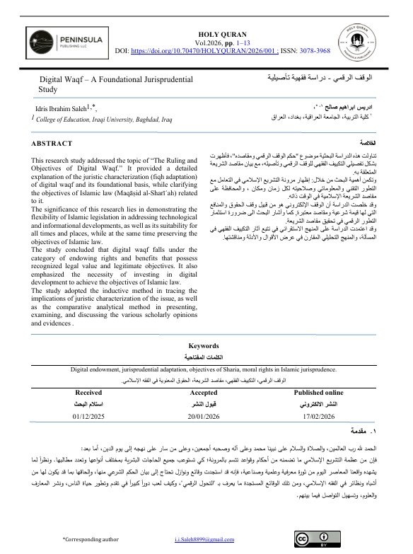 Holy Quran (E_ISSN: 3078-3968) is dedicated to advancing scholarly research on the teachings, interpretations, and applications of the Holy Quran. Published by Peninsula Publishing Press in Dubai, this journal serves as a platform for academics, researchers, and theologians to explore the profound wisdom and spiritual guidance found within the Quran. The journal welcomes a wide range of contributions, including analytical studies, comparative research, and contemporary applications, fostering a deeper understanding of the Quran’s impact on society, culture, and individual lives.