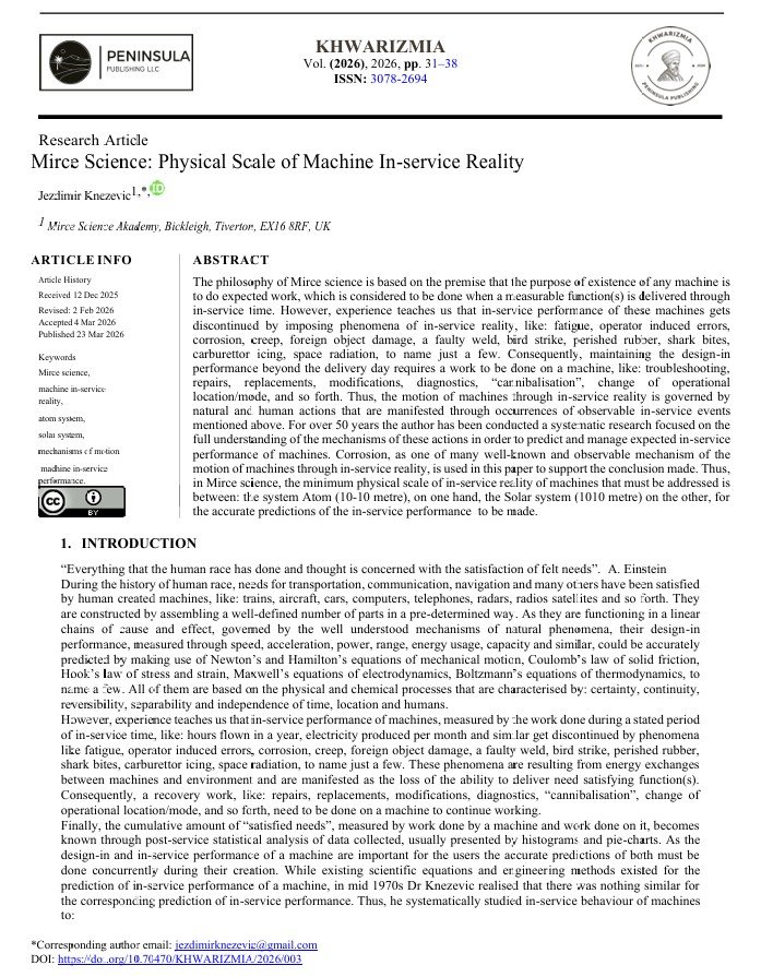 The philosophy of Mirce science is based on the premise that the purpose of existence of any machine is to do expected work, which is considered to be done when a measurable function(s) is delivered through in-service time. However, experience teaches us that in-service performance of these machines gets discontinued by imposing phenomena of in-service reality, like: fatigue, operator induced errors, corrosion, creep, foreign object damage, a faulty weld, bird strike, perished rubber, shark bites, carburettor icing, space radiation, to name just a few. Consequently, maintaining the design-in performance beyond the delivery day requires a work to be done on a machine, like: troubleshooting, repairs, replacements, modifications, diagnostics, “cannibalisation”, change of operational location/mode, and so forth. Thus, the motion of machines through in-service reality is governed by natural and human actions that are manifested through occurrences of observable in-service events mentioned above. For over 50 years the author has been conducted a systematic research focused on the full understanding of the mechanisms of these actions in order to predict and manage expected in-service performance of machines. Corrosion, as one of many well-known and observable mechanism of the motion of machines through in-service reality, is used in this paper to support the conclusion made. Thus, in Mirce science, the minimum physical scale of in-service reality of machines that must be addressed is between: the system Atom (10-10 metre), on one hand, the Solar system (1010 metre) on the other, for the accurate predictions of the in-service performance to be made.